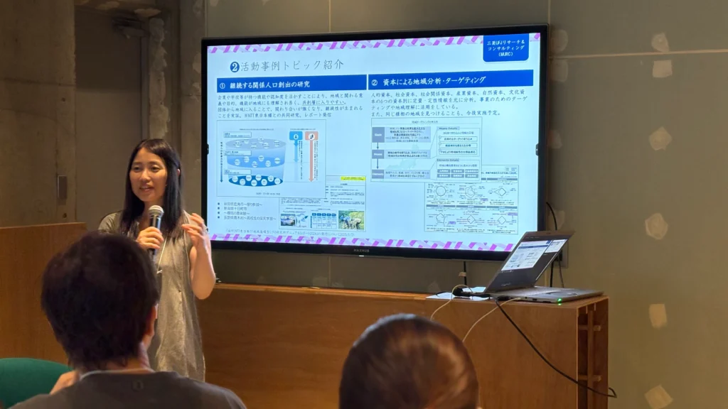 各社様の取り組みを少しご紹介させていいとただきますと、ソラシドエア様は主に九州の拠点を活かしながら、地方自治体との密な連携やイベント企画をされています。日本出版販売様は「文喫」という入場料制の本屋をはじめ、地域における持続的な書店を目指したビジネスモデルを展開されています。日本旅行様は、ふるさと納税事業や強い海外ネットワークを生かしたグローバル人材活用推進事業をされています。三越伊勢丹ホールディングス様は、三越伊勢丹発のカジュアルギフトEC&メディア「MOO:D MARK BY ISETAN (ムードマーク)」を中心に、ギフトを通じた豊かなコミュニケーション文化醸成と、地域商材による地域経済の後押しに注力されています。三菱UFJリサーチ&コンサルティング様は、地域での地道なフィールドワークを基に地域資本の分析を行い、地域資源を活用した事業創出をされています。この各社紹介の時間を通じて語られた内容をを少しだけご紹介します👇